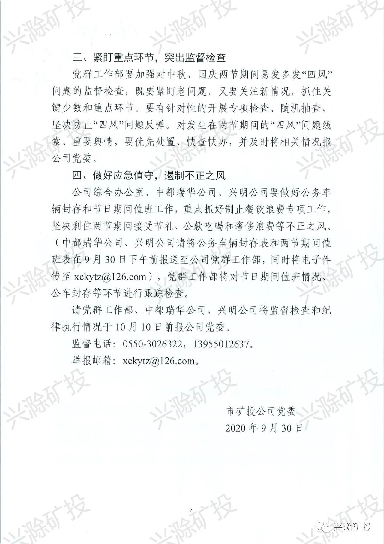 市礦投公司關(guān)于加強2020年中秋國慶兩節(jié)期間廉潔紀律工作的通知