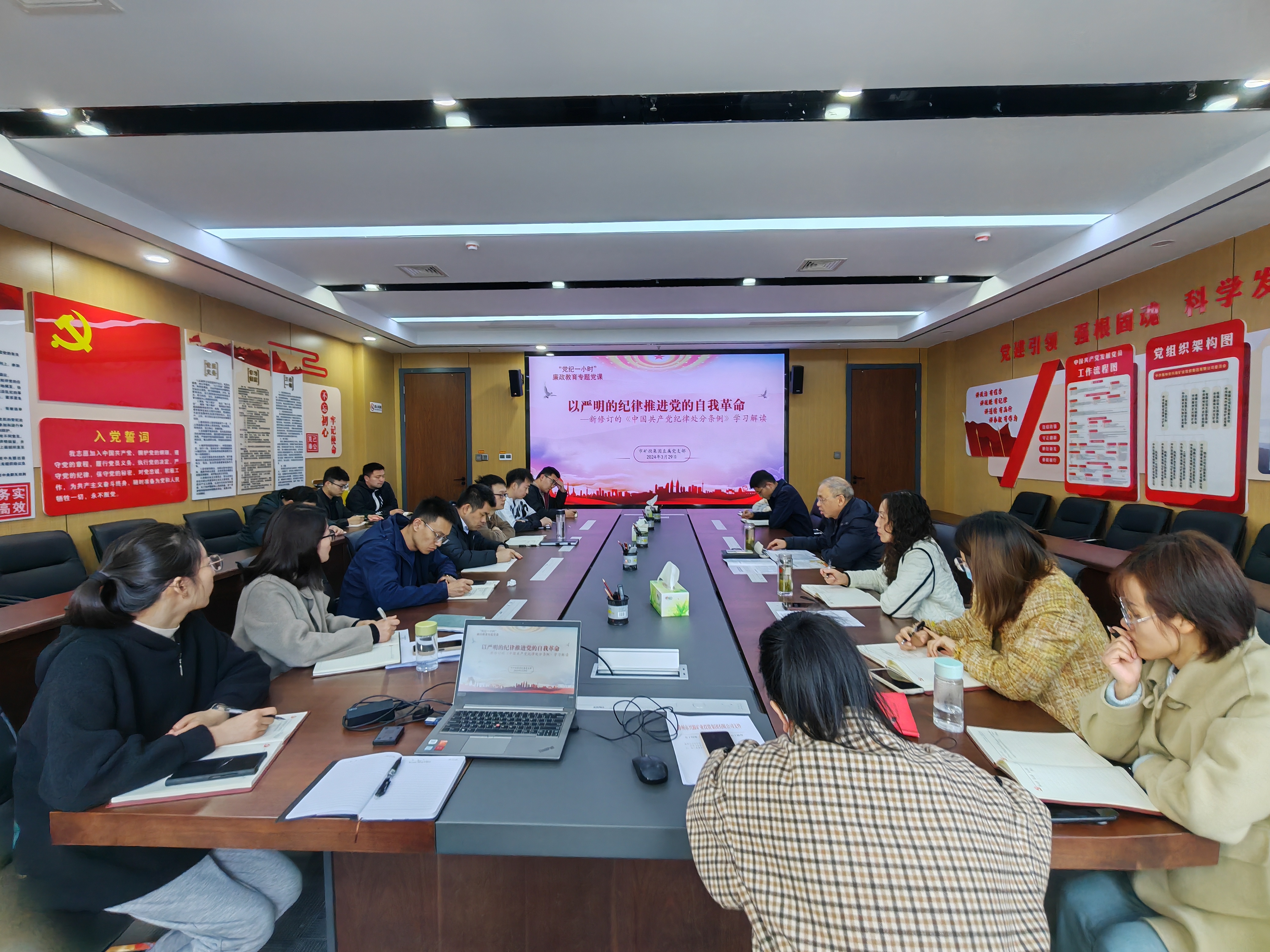為進(jìn)一步學(xué)深悟透習(xí)近平總書記關(guān)于黨的自我革命的重要思想,推進(jìn)全面從嚴(yán)治黨向縱深發(fā)展,3月29日,市礦投集團(tuán)以學(xué)習(xí)貫徹新修訂的紀(jì)律處分條例為契機(jī),開(kāi)展“黨紀(jì)一小時(shí)”宣講教育活動(dòng)。市礦投集團(tuán)黨委委員、駐市礦投集團(tuán)紀(jì)檢監(jiān)察組組長(zhǎng)芮金保以“以嚴(yán)明的紀(jì)律推進(jìn)黨的自我革命“為題,圍繞學(xué)習(xí)解讀新修訂《中國(guó)共產(chǎn)黨紀(jì)律處分條例》進(jìn)行宣講。