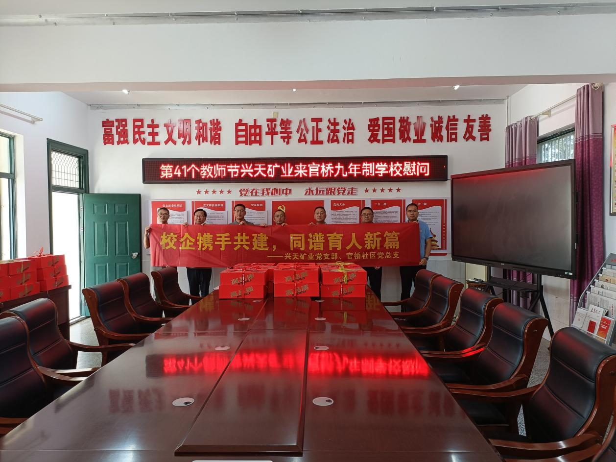 9月10日,興天礦業(yè)黨支部聯(lián)合官橋社區(qū)黨總支前往諭興九年制學(xué)校、官橋九年制學(xué)校,開(kāi)展教師節(jié)慰問(wèn)活動(dòng),向辛勤耕耘在教育一線(xiàn)的教師們致以節(jié)日問(wèn)候和崇高敬意。