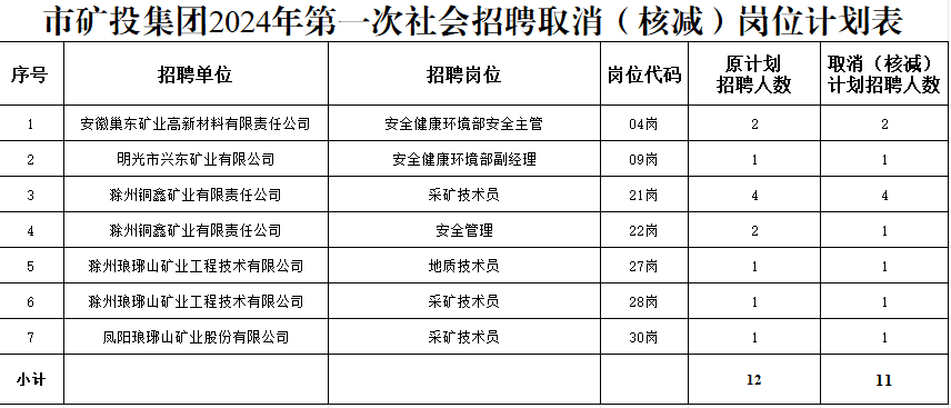 根據(jù)《滁州市興滁礦業(yè)投資集團(tuán)有限公司2024年第一次社會招聘公告》規(guī)定,經(jīng)對各崗位報(bào)名情況篩查審定,結(jié)合資格復(fù)審情況,部分崗位報(bào)名情況未達(dá)到開考比例,經(jīng)研究決定取消(核減)以下崗位招聘計(jì)劃: