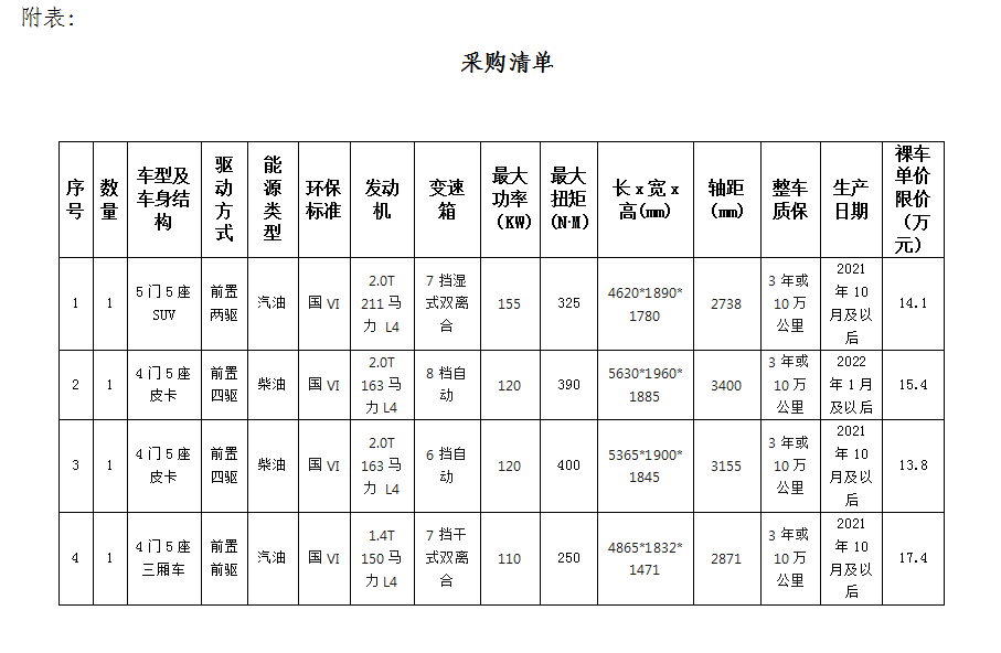 1.根據(jù)業(yè)務(wù)發(fā)展需要,滁州市興元商貿(mào)有限公司擬集中采購(gòu)業(yè)務(wù)保障車輛共計(jì)4輛,詳情見(jiàn)附表。